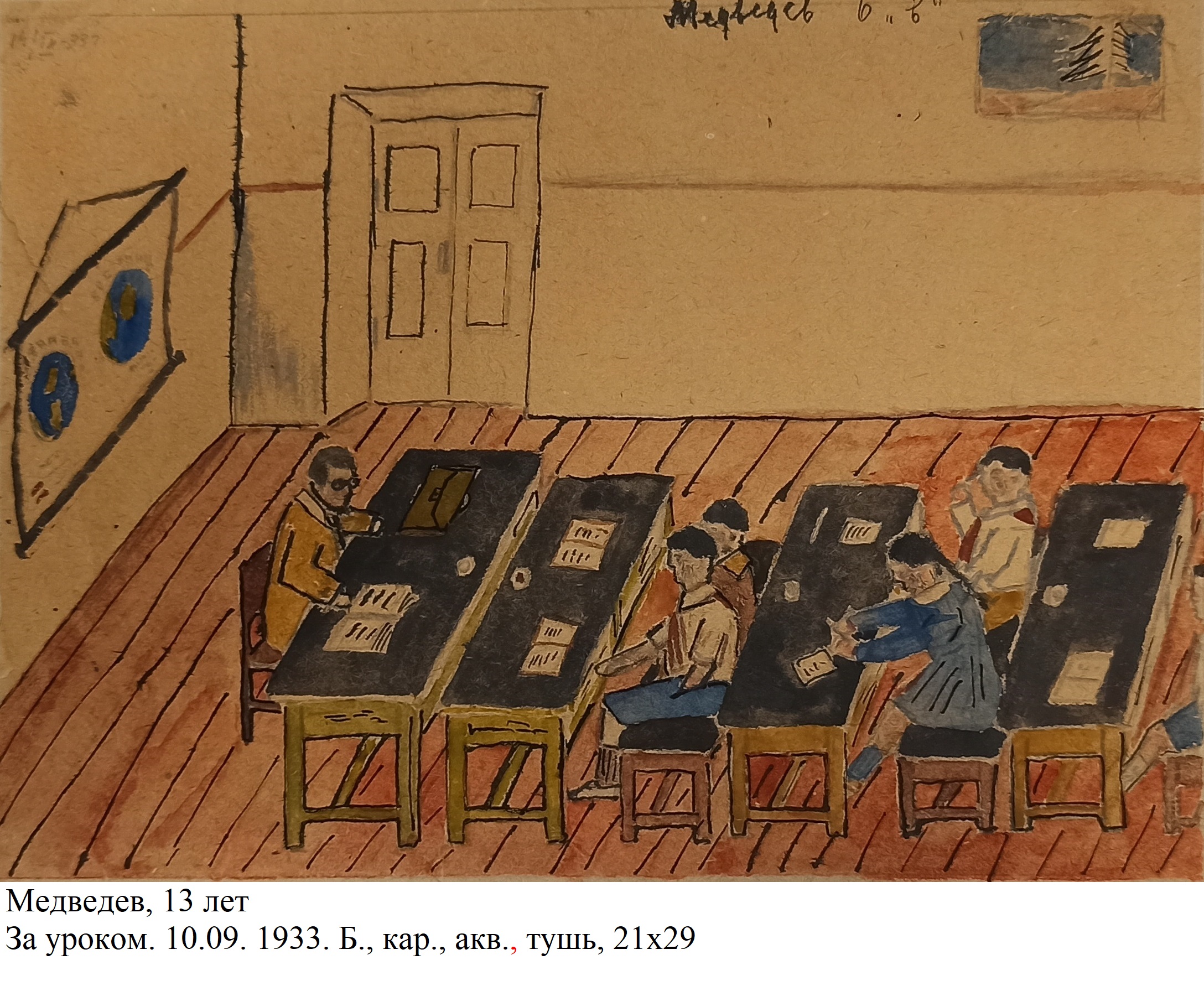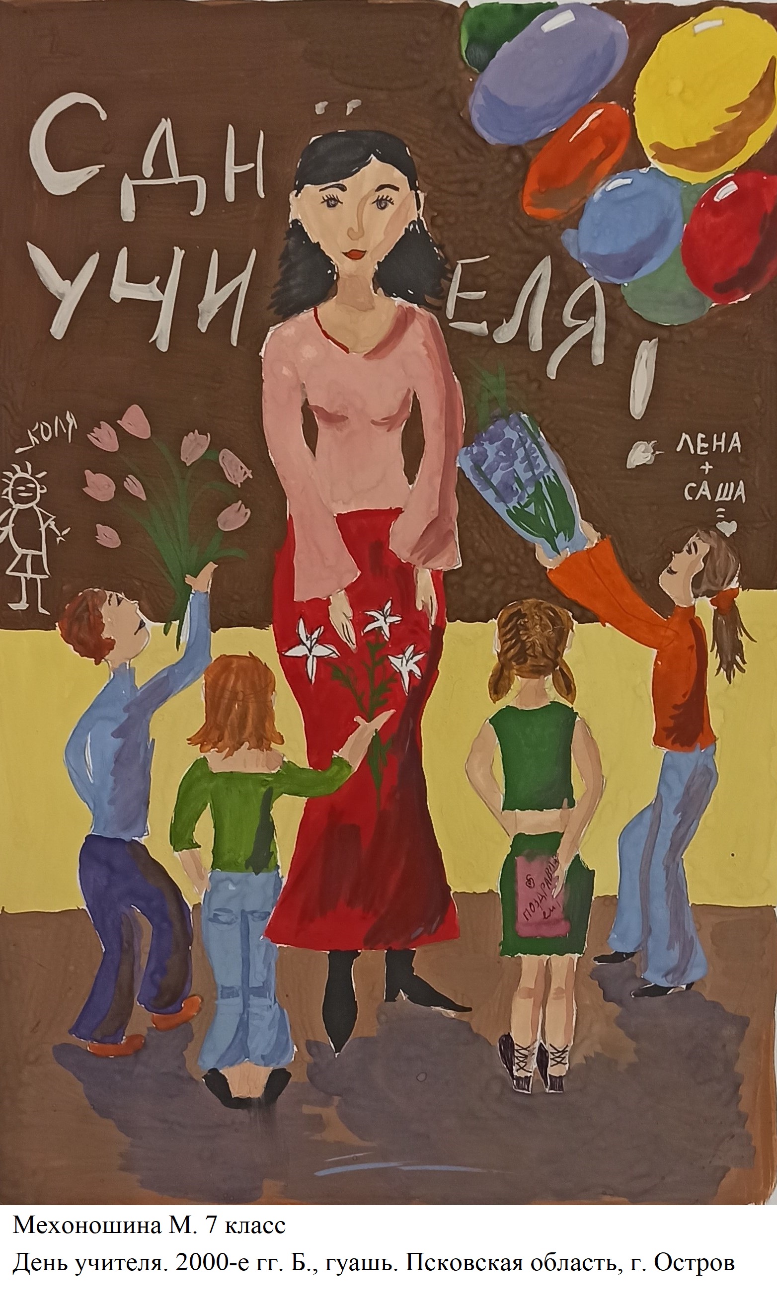 На выставке представлен образ учителя в рисунках участников Всероссийских конкурсов, посвященных проблемам мировосприятия школьников: «Мир детей – мир для детей» (1995 г.), «Герой нашего времени» (2009 г.), «Моя страна – наш мир» (2014 г.), «В какой школе я хочу учиться» (2016 г.), «Россия будущего» (2023 г.).
