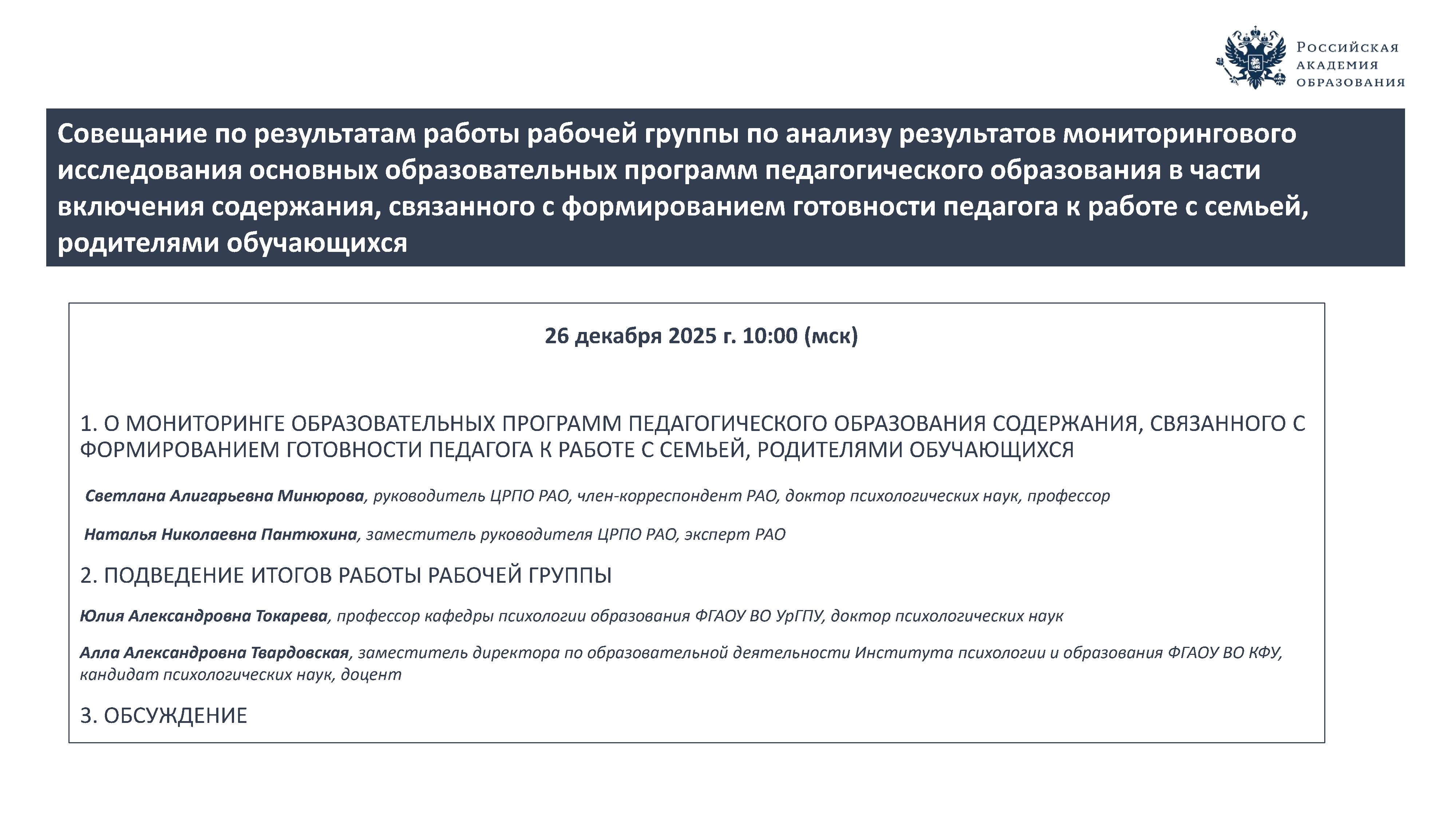 26 декабря 2025 года состоялось рабочее совещание, посвященное обсуждению результатов мониторингового исследования основных образовательных программ педагогического образования в части включения содержания, связанного с формированием готовности педагога к работе с семьей, родителями обучающихся.