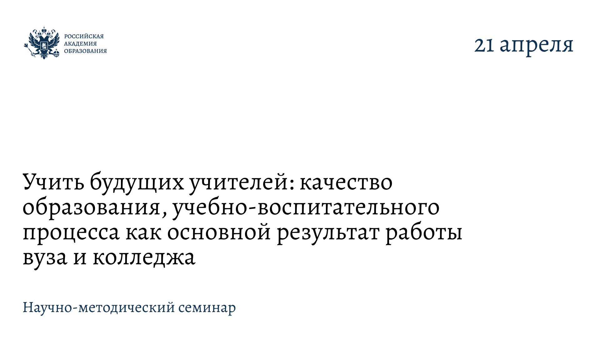 21 апреля в здании президиума Российской академии образования на Большой Полянке состоится научно-методический семинар «Учить будущих учителей: качество образования, учебно-воспитательного процесса как основной результат работы вуза и колледжа». Мероприятие пройдет в очном и дистанционном форматах.
