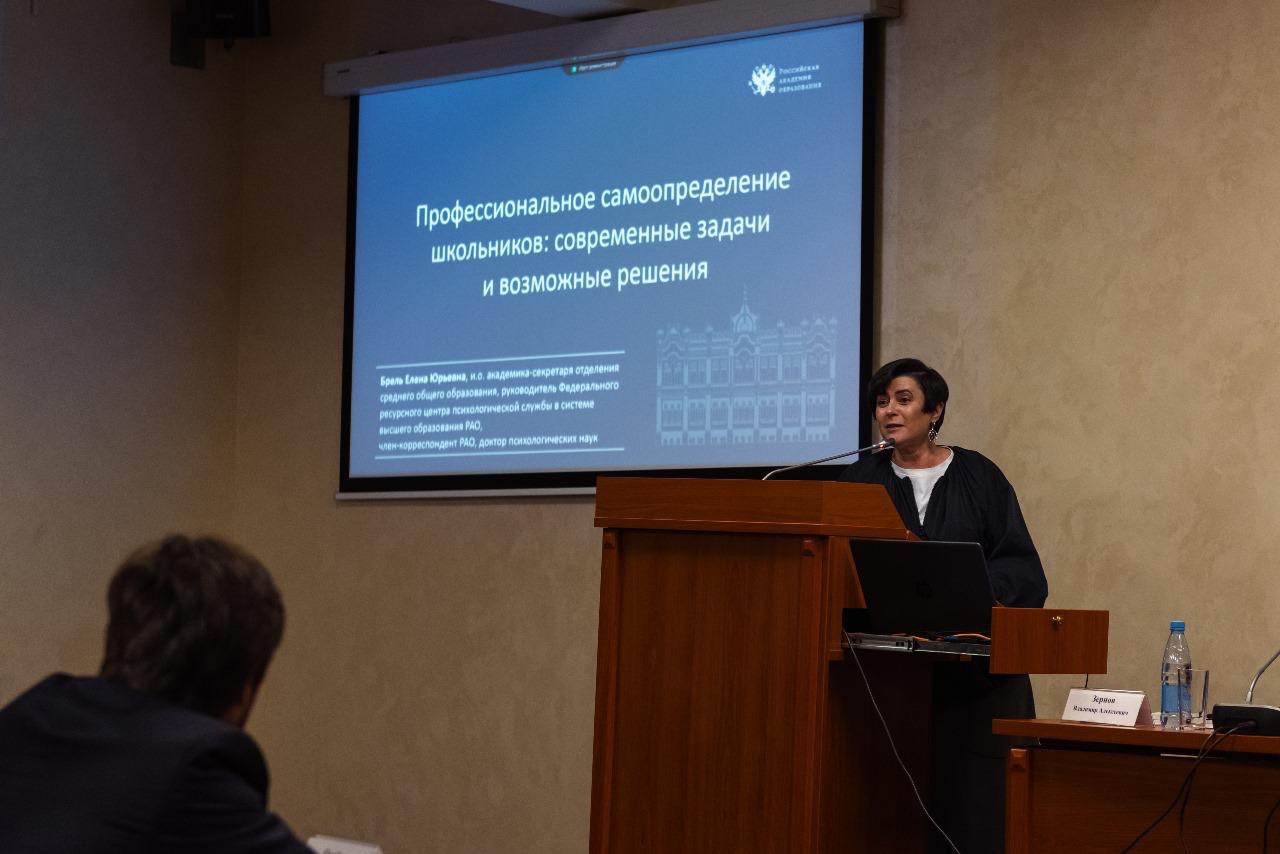 И.о. академика-секретаря Отделения общего среднего образования РАО, руководитель научной школы РАО «Профессиональное самоопределение и профессиональная ориентация школьников», член-корреспондент РАО Елена Юрьевна Брель представила современные задачи и возможные решения в области профессионального самоопределения школьников. Елена Юрьевна отметила, что профессиональное самоопределение школьников в России прошло путь от ориентации на кадровые запросы государства в советское время до личностно-ориентированного подхода современного периода. Это остается ключевой составляющей общего процесса социализации и подготовки молодежи к трудовой деятельности и основой формирования готовности к самостоятельному и осознанному выбору жизненного пути.