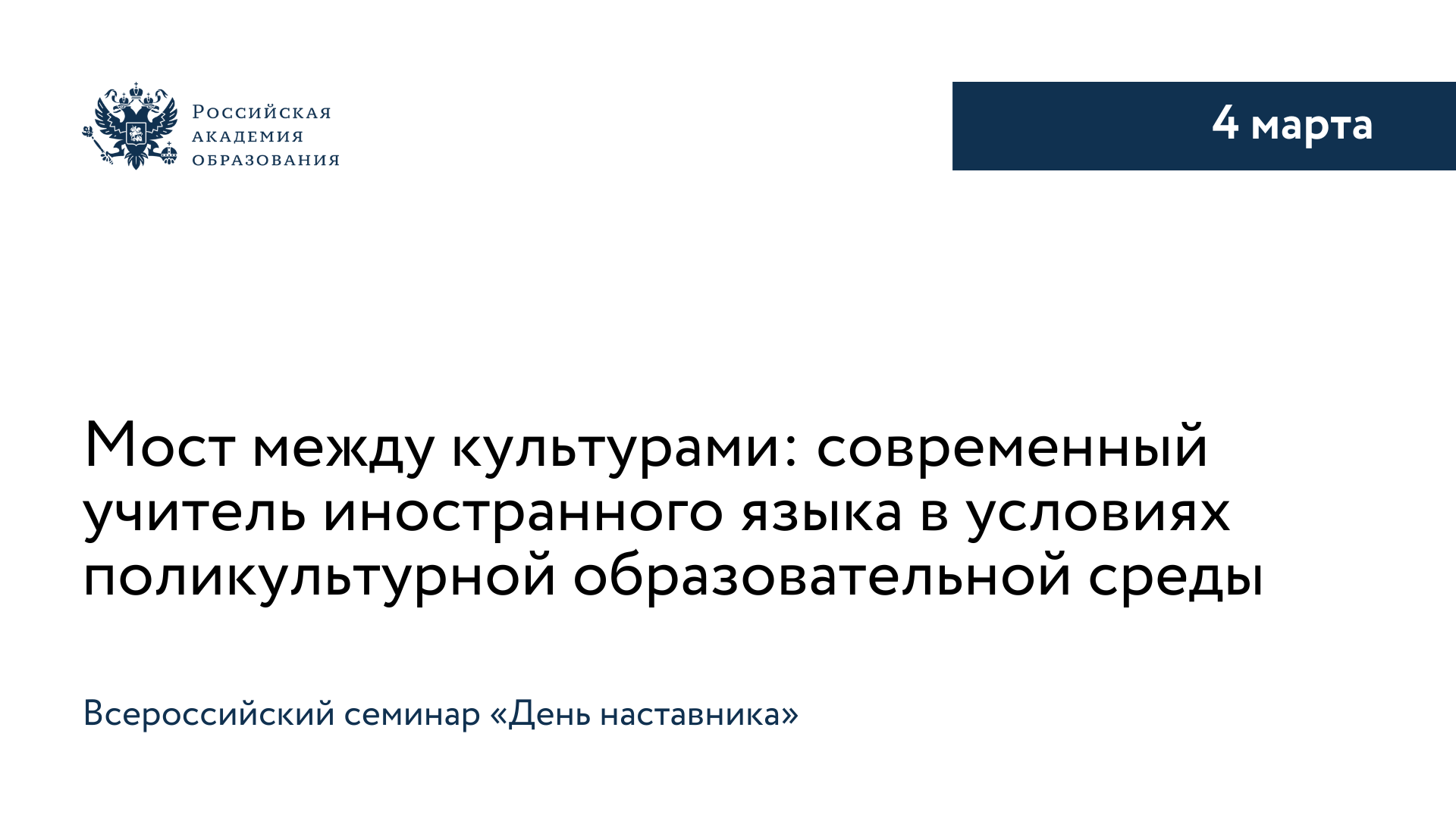 4 марта в здании президиума Российской академии образования на Большой Полянке для преподавателей иностранных языков и методистов состоится Всероссийский семинар «День наставника: «Мост между культурами: современный учитель иностранного языка в условиях поликультурной образовательной среды». Мероприятие приурочено к Году единства народов России.