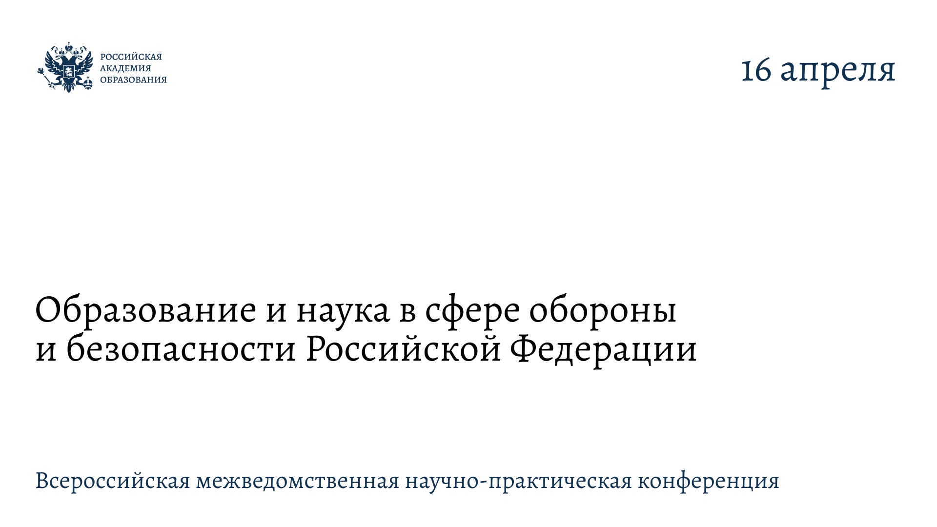 16 апреля Российская академия образования и Военный университет имени князя Александра Невского Министерства обороны Российской Федерации проводят Всероссийскую межведомственную научно-практическую конференцию «Образование и наука в сфере обороны и безопасности Российской Федерации». В рамках конференции в очном формате состоится заседание Научного совета по развитию образования в сфере оборонных отраслей при президиуме Российской академии образования.