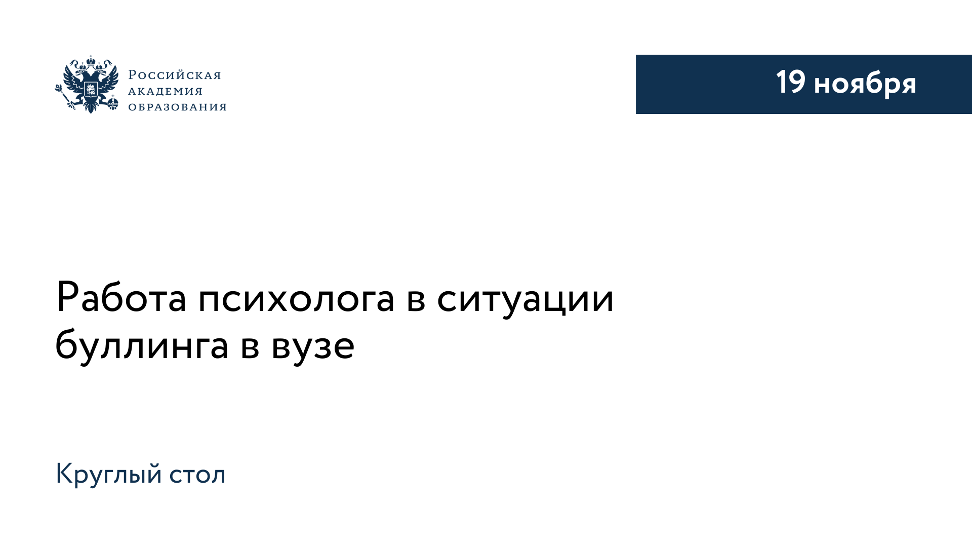 19 ноября в Библиотеке им. К.Д. Ушинского Федеральный ресурсный центр психологической службы в системе высшего образования (ФРЦ) РАО в рамках серии мероприятий, посвященных профилактике буллинга, проведет тематический круглый стол «Работа психолога в ситуации буллинга в вузе». Мероприятие пройдет в очном и дистанционном форматах.