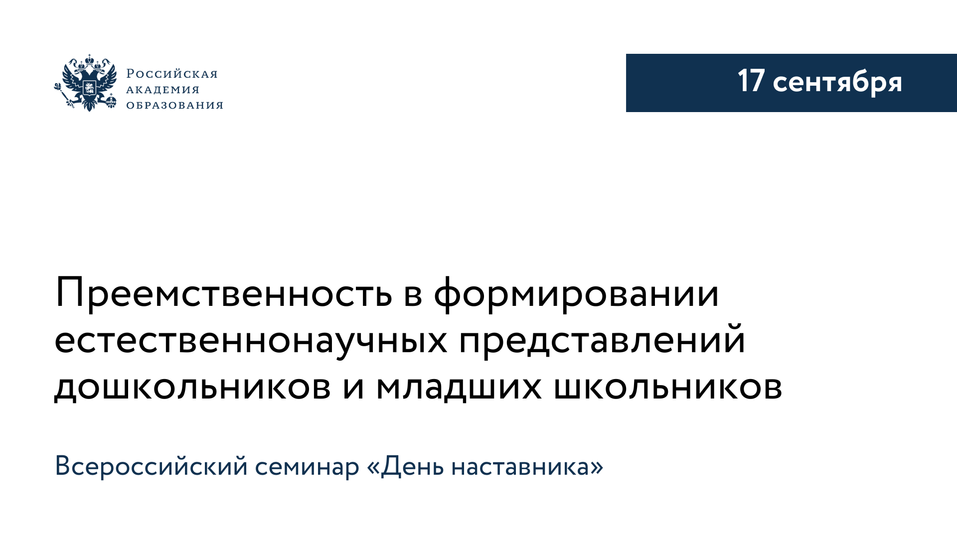 17 сентября в здании президиума Российской академии образования на Большой Полянке состоится Всероссийский семинар «День наставника: Преемственность в формировании естественнонаучных представлений дошкольников и младших школьников». Мероприятие пройдет в рамках реализации проекта «Педагогическая Полянка РАО».
