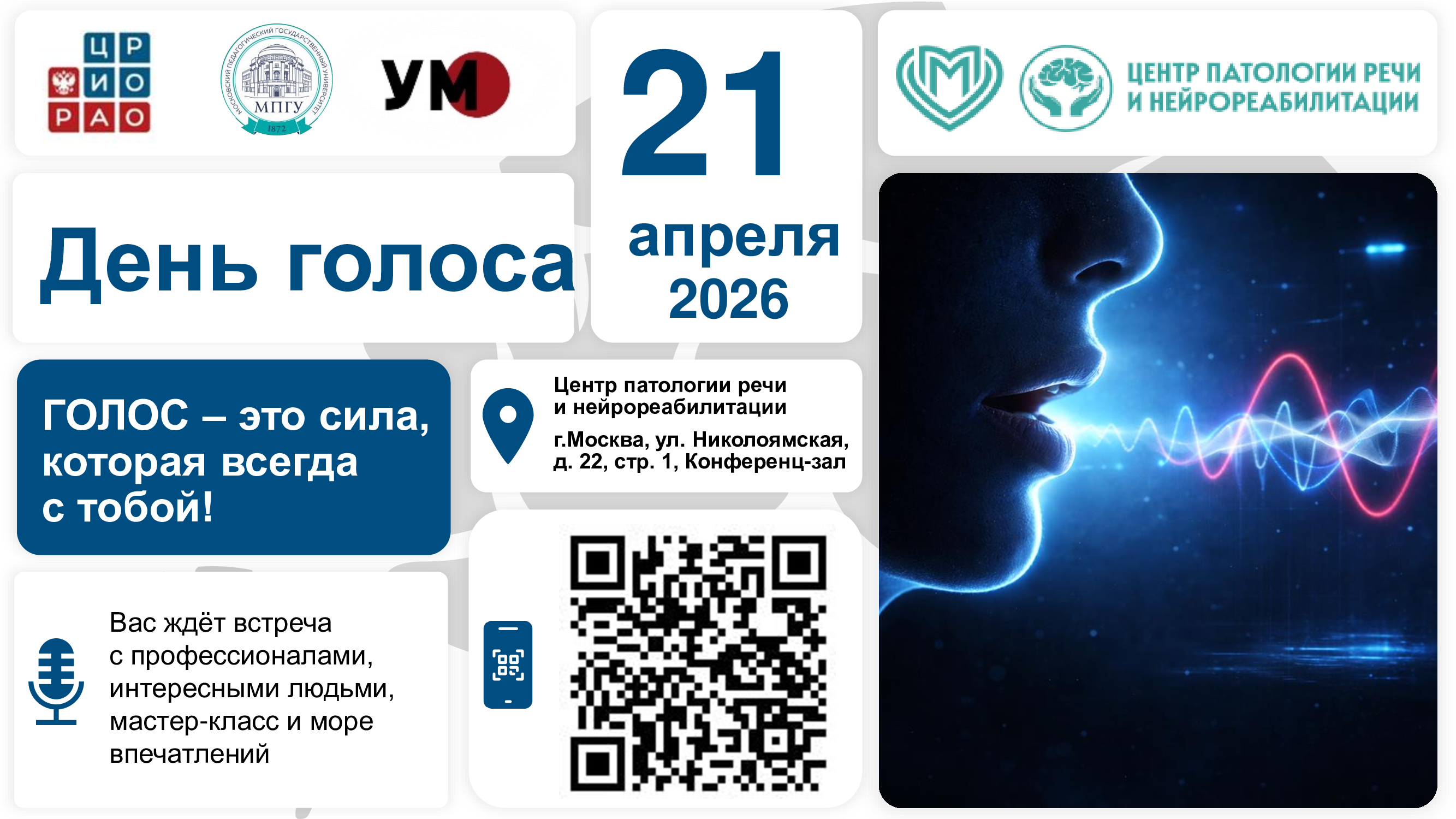 21 апреля в Центре патологии речи и нейрореабилитации Департамента здравоохранения города Москвы состоится просветительское мероприятие «Голос – это сила, которая всегда с тобой!», посвященное Всемирному дню голоса.