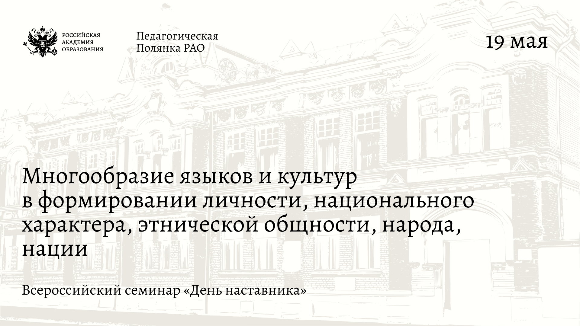 19 мая в здании Президиума Российской академии образования на Большой Полянке состоится Всероссийский семинар «День наставника» по теме «Многообразие языков и культур в формировании личности, национального характера, этнической общности, народа, нации». Мероприятие приурочено к Году единства народов России.