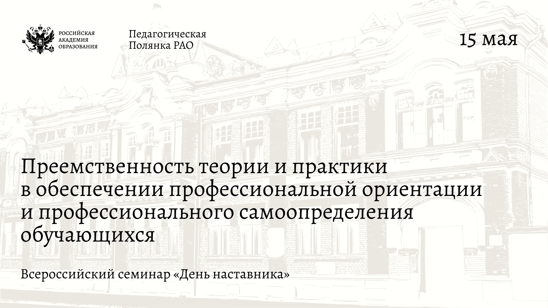 15 мая в здании президиума Российской академии образования на Большой Полянке состоится Всероссийский семинар «День наставника» на тему «Преемственность теории и практики в обеспечении профессиональной ориентации и профессионального самоопределения обучающихся».