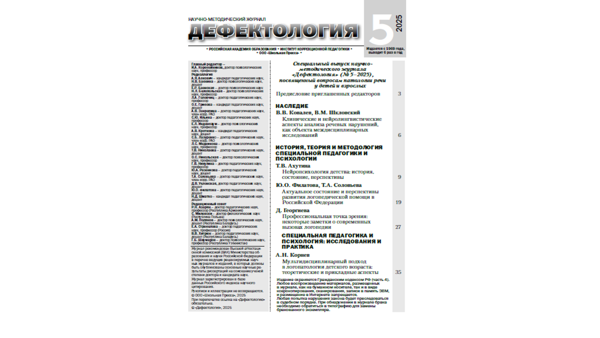 Вышел в свет специальный выпуск научно-методического журнала «Дефектология» (№ 5 – 2025), в котором представлены статьи по материалам ключевых докладов II Международного симпозиума «Проблемы патологии речи у детей и взрослых», состоявшегося 16–18 октября 2024 года в Москве.